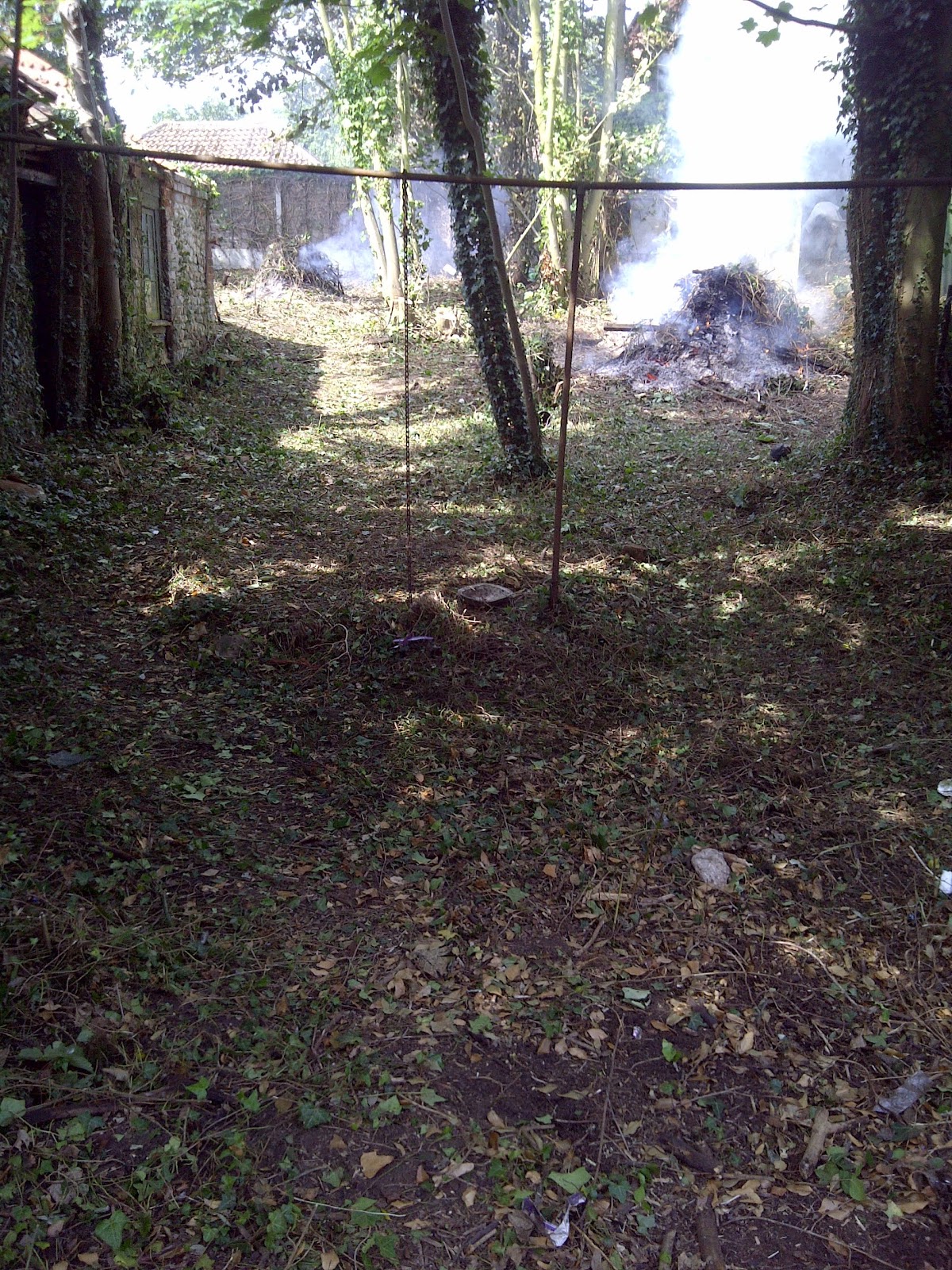 With the heat of the day over 75 and the wind non existent the neighbours washing took a bit of a hammering (we warned them yesterday) as the fires burned all day. Well with no access to get a chipper and lorry in we had no choice but to burn the discarded garden. For every layer of ivy we took up another layer of branches were uncovered. All of us ended up with eyes streaming from the smoke, stinging nettle reminders all over us and the occasional thorn. Then there were the two cuts to my head where i walked into the metal pole across the garden on two separate occasions.The neighbours must of loved the garden in some ways as they dumped enough of their own rubbish over the fence. Apart from the nosy neighbours we were greeted with joyous thanks from the others. Treasures were found! an old lunch box still with food in it, Frisbee, pen set, rusty nails and a wheel barrow.